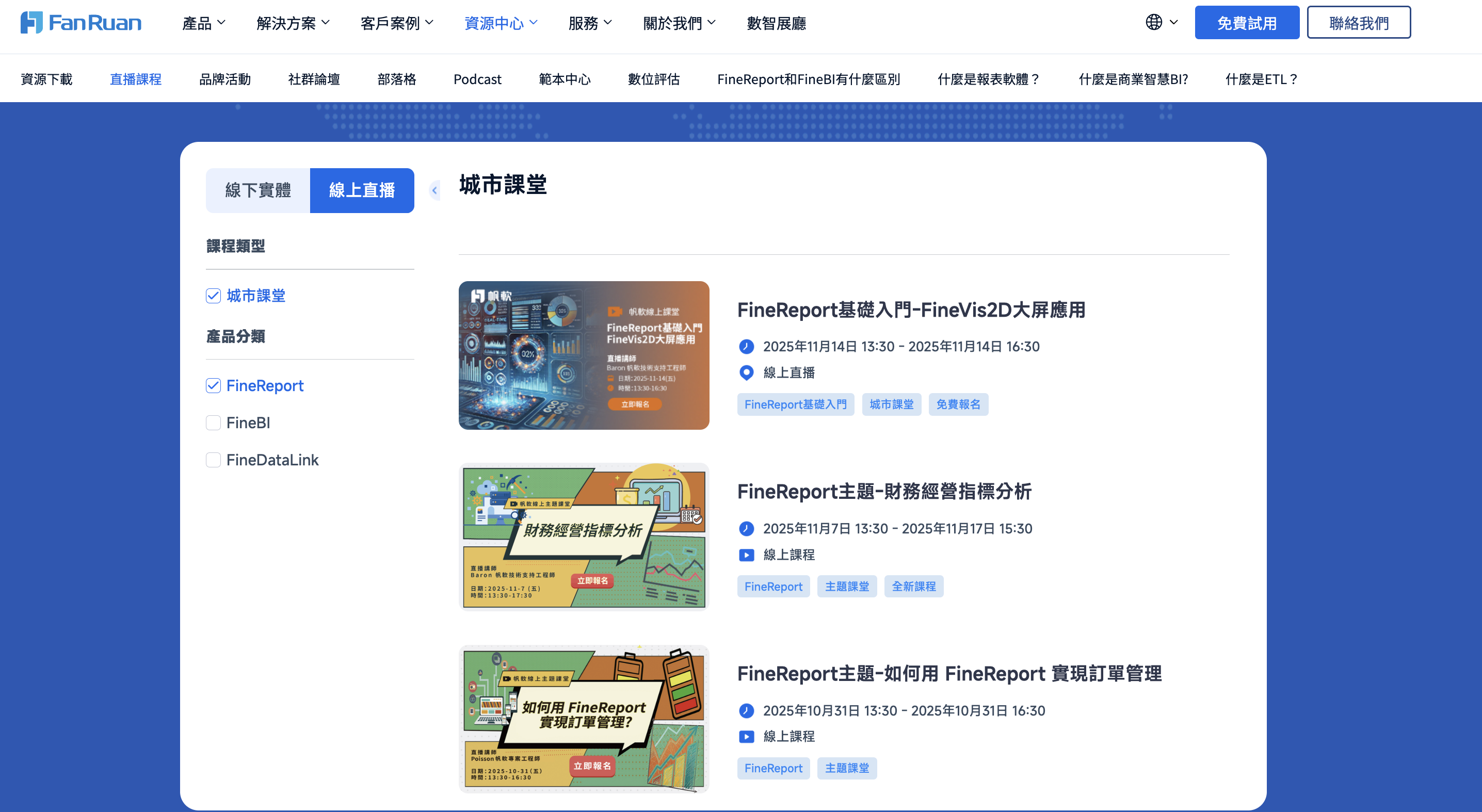 我覺得帆軟FineReport做得最好的的部分,一個是提供大量免費線下的課程,一個就是線上客服。如果還有問題自己查閱資料沒辦法搞定,可以直接找線上客服,報表技術支援工程師工作日都會線上解答你的問題,在官網的右側點擊即可:https://www.finereport.com/tw/