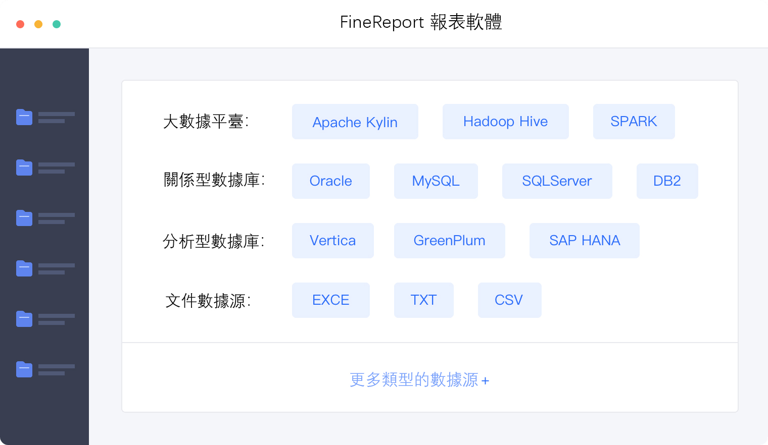 FineReport支援Hadoop、GreenPlumn、Kylin等大數據平臺,支援SAP HANA、SAP BW、SSAS、EssBase等多維資料庫,支援MongoDB、SQLite、Cassandra等NO SQL資料庫,也支援傳統的關係型資料庫、程式資料來源等。